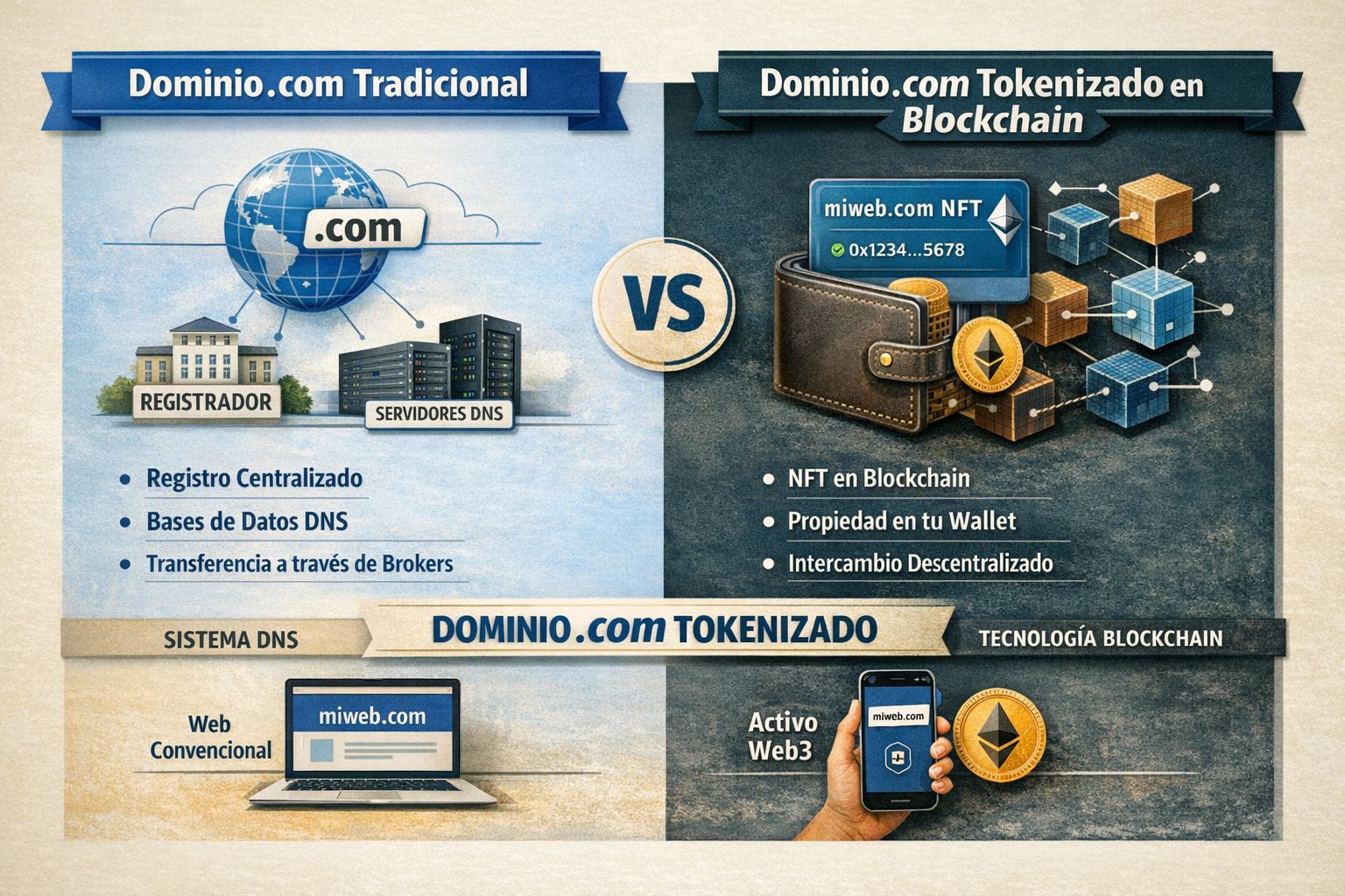 Es importante entender que el dominio no deja de funcionar en el sistema DNS tradicional. La tokenización no sustituye el .com: lo expande al entorno Web3.